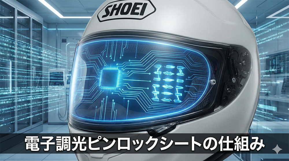 シールドそのものではなく、シールドの内側に貼る「防曇シート(ピンロックシート)」に液晶フィルムが組み込まれていて、電気を通すことで色が変わる仕組み。すごい時代になりましたね…。