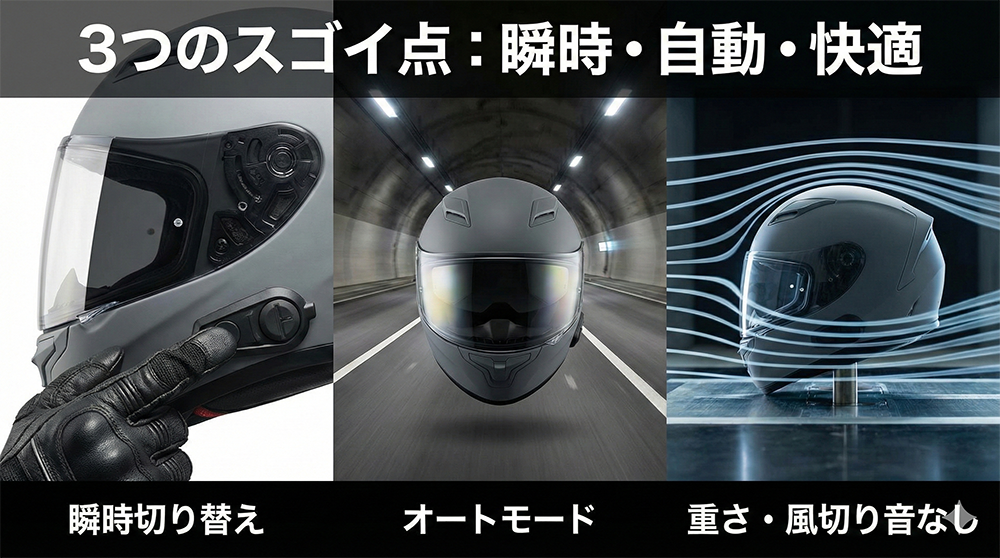 昼間の眩しさを防ぐためにスモークシールドにすると、トンネルや夜道で「何も見えない!」って焦ったこと、ありますよね。