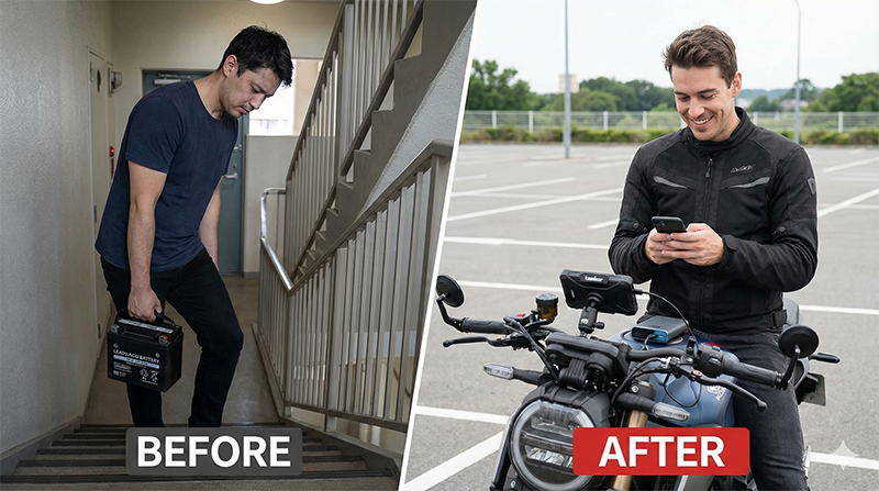 特に、ボクみたいにマンション住まいや月極駐車場を借りているライダーにとって、バッテリー管理は永遠の課題。 コンセントがないから充電器も繋げないし、毎回重たいバッテリーを外して部屋まで運ぶなんて、正直「何の罰ゲーム?」って感じです。
